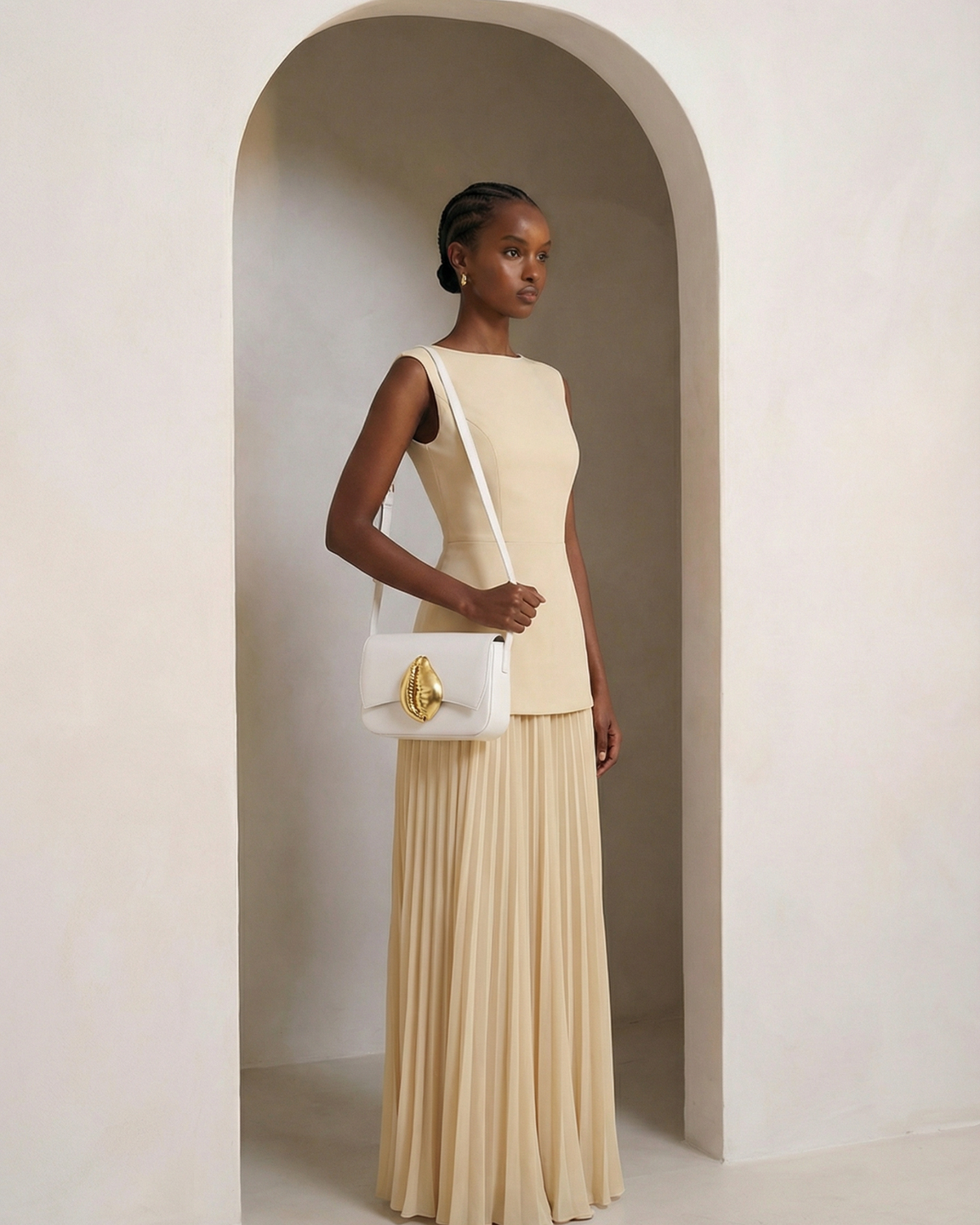 Découvrez notre superbe sac coquillage Régine, où design épuré et fonctionnalité se marient. Fabriqué à partir de cuir de première qualité et de métaux cauris dorés uniques, ce sac présente une forme cylindrique unique qui se démarque dans n'importe quelle tenue. Son intérieur spacieux, sa fermeture sécurisée et sa bandoulière réglable en font l'accessoire parfait pour un usage quotidien et des occasions spéciales. Rehaussez votre style avec ce classique moderne.